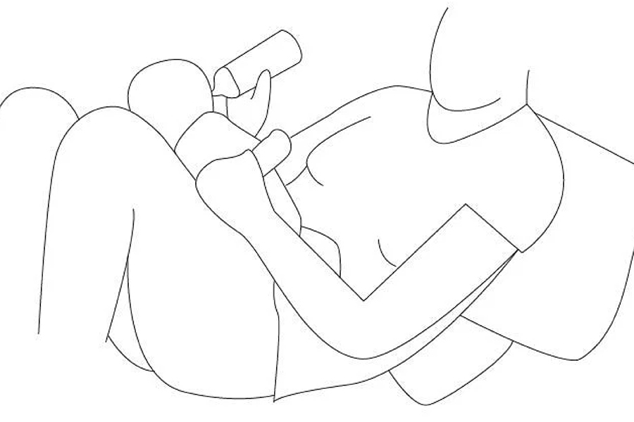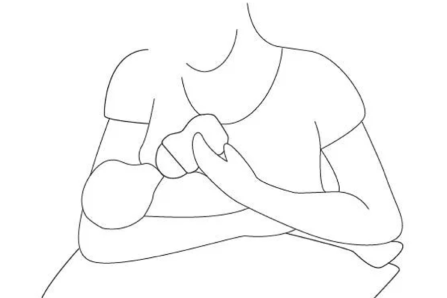 ✔️坐姿法:讓寶寶背對你坐在腿上,一手托住下巴與下顎(避免壓迫喉嚨),身體微微前傾,另一手輕拍背部。
