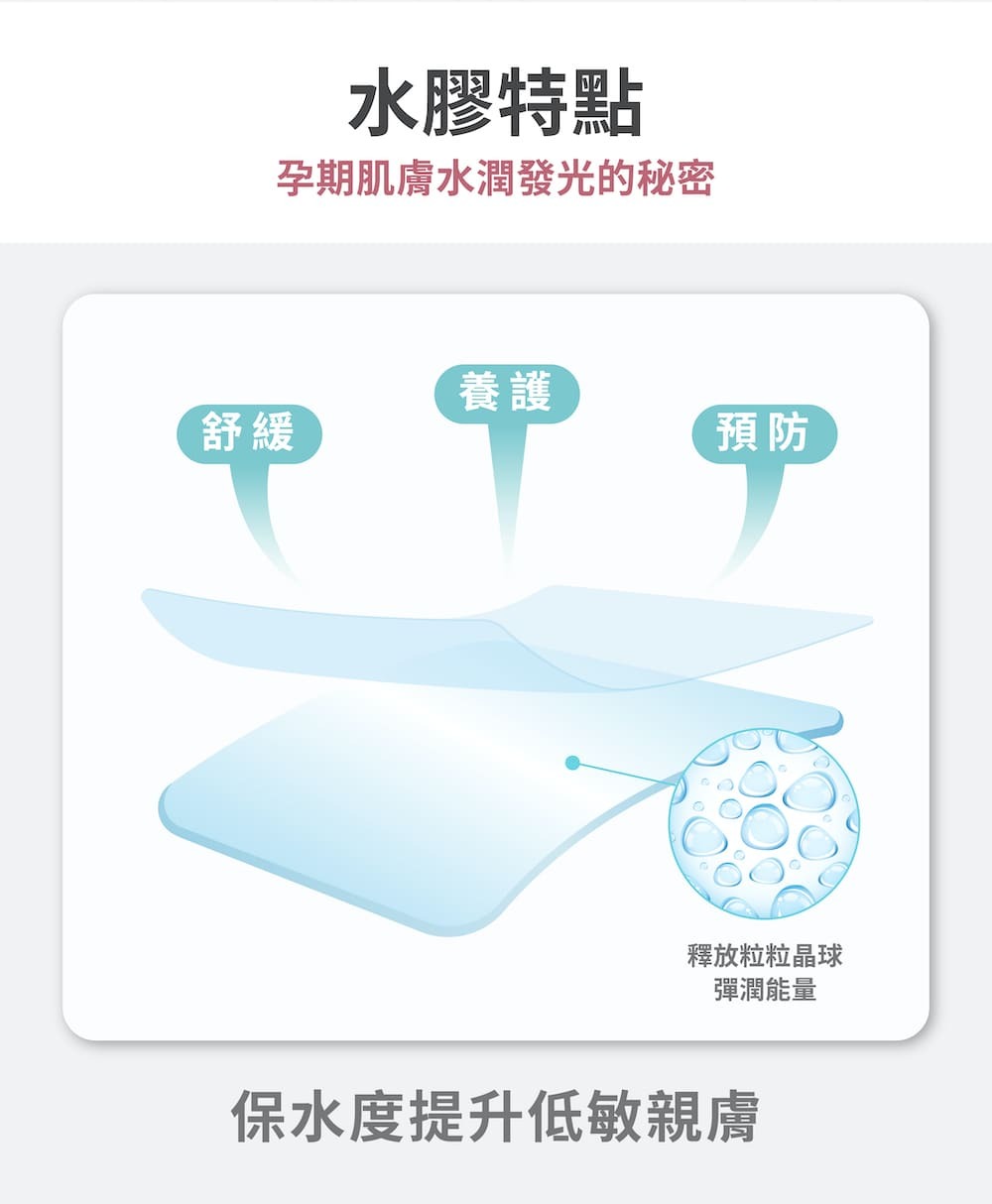 不再為使用的妊娠保濕精華保養品,被衣服抹掉、浪費而煩惱!高親膚性保濕水膠能持久均勻釋放修護能量,24小時長效保濕、全天候不間斷鎖水!持續優化肌膚長效保濕之效力,降低肌膚細紋的生成