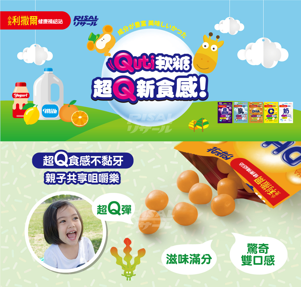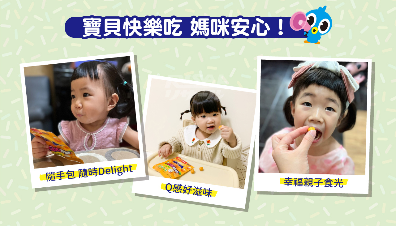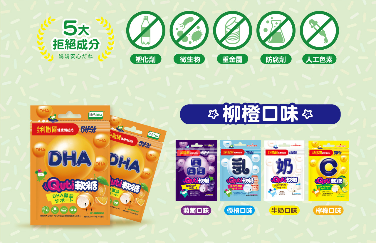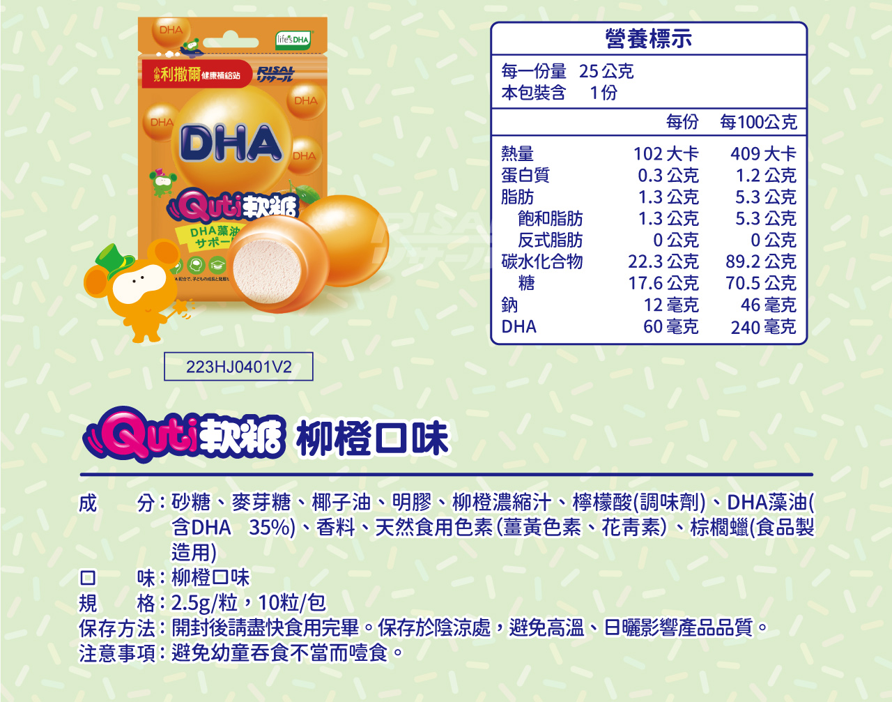 ●柳橙口味: 砂糖、麥芽糖、椰子油、明膠、柳橙濃縮汁、檸檬酸(調味劑)、DHA藻油(含DHA 35%)、香料、天然食用色素(薑黃色素、花青素)、棕櫚蠟(食品製造用劑)。
