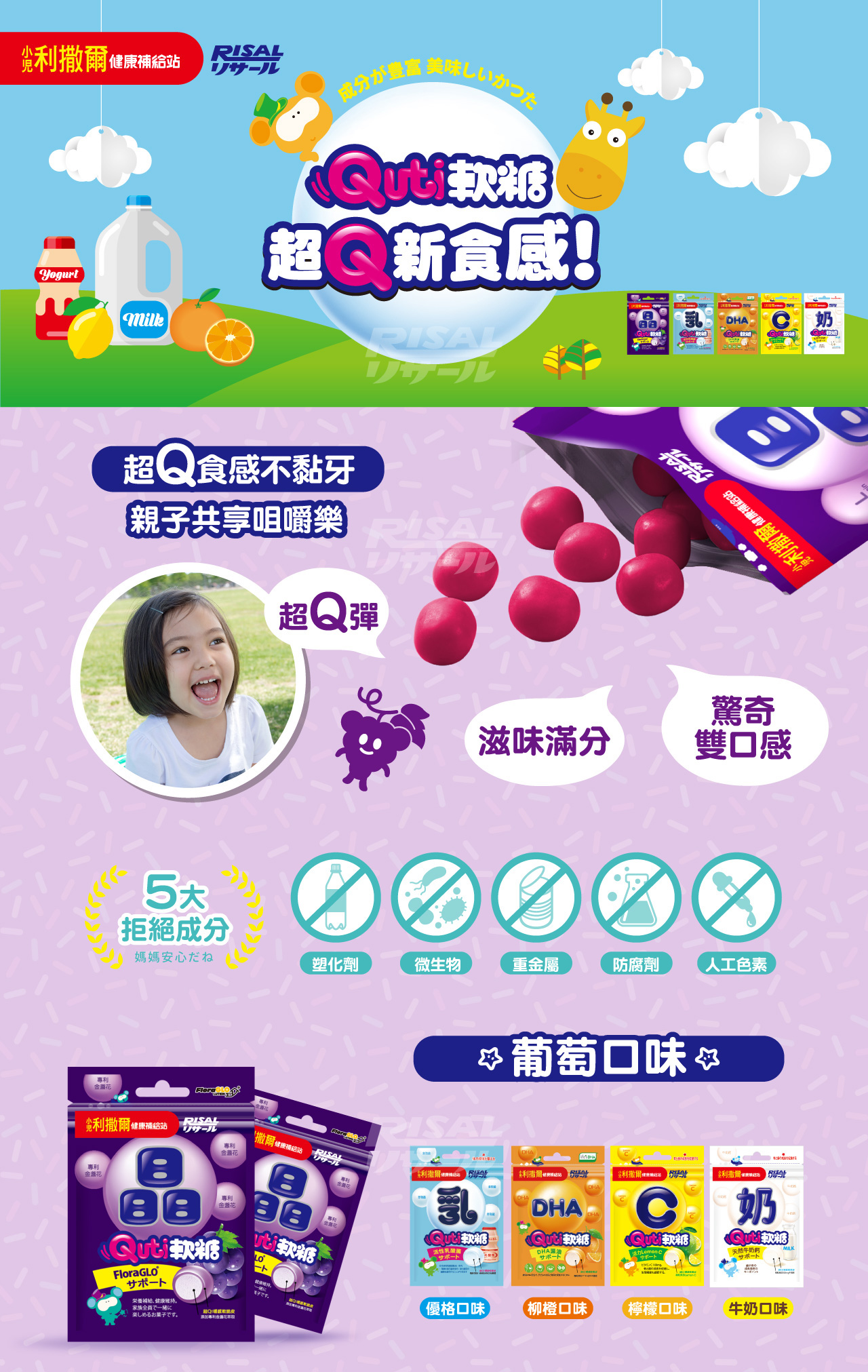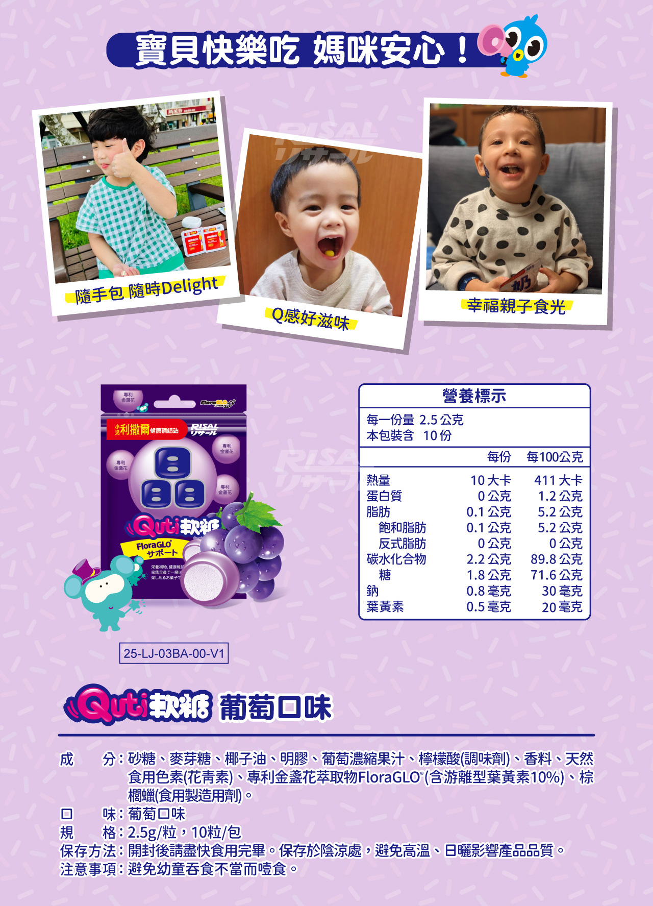 ●葡萄口味: 砂糖、麥芽糖、椰子油、明膠、葡萄濃縮果汁、檸檬酸(調味劑)、香料、天然食用色素(花青素)、專利金盞花萃取物FloraGLO(含游離型葉黃素10%)、棕櫚蠟(食品製造用劑)。