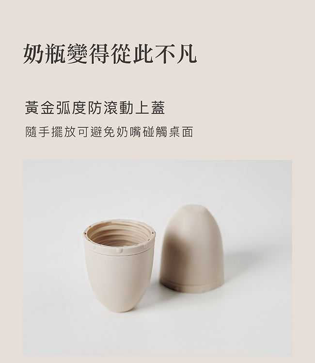 1. 黃金弧度上蓋防滾動,隨手擺放可避免奶嘴碰觸桌面。
