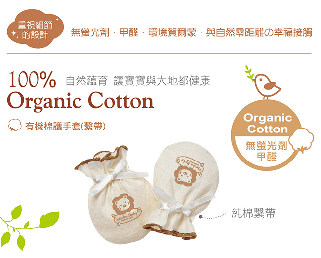 | 注意事項 | 有機棉布不使用任何化學添加劑, 不做精煉及漂白, 如有棉花莖葉組織產生的褐色小點屬正常現象, 經多次洗滌後即自然脫落。 |
