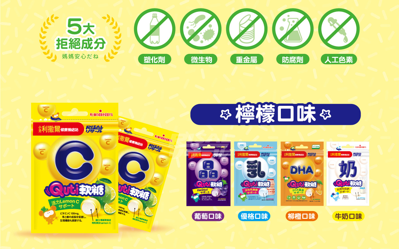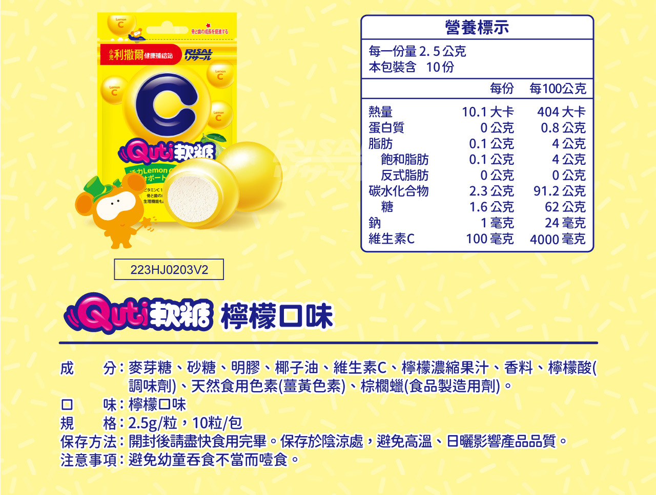●檸檬口味: 麥芽糖、砂糖、明膠、椰子油、維生素C(抗氧化劑)、檸檬濃縮果汁、香料、檸檬酸(調味劑)、天然食用色素(薑黃色素)、棕櫚蠟(食品製造用劑)。