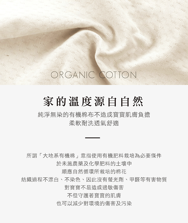 ⚠ 有機棉布上天然褐色小點為棉花的莖葉組織,屬正常現象,經多次洗滌後會自然脫落,請安心使用。
