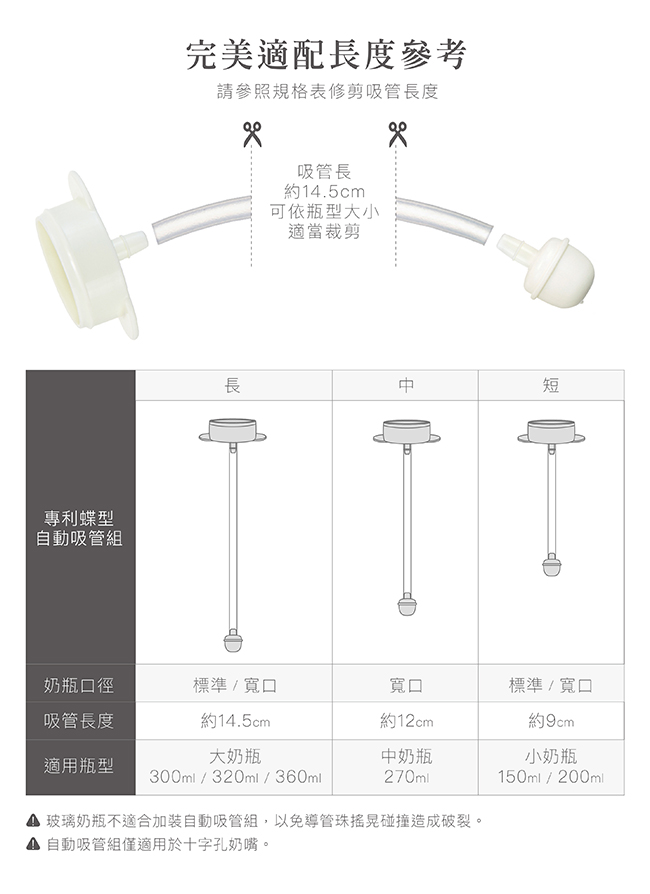 | 注意事項 | 使用前請依瓶型及使用配件,適當裁剪吸管長度 |