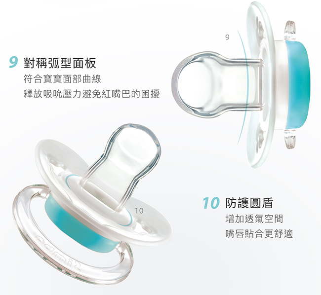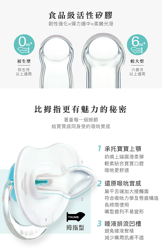 2.拇指型特殊造型設計,符合嬰兒唇齒構造,長時間吸吮使寶寶嘴型不變形,讓牙齦與齒列正常發展。