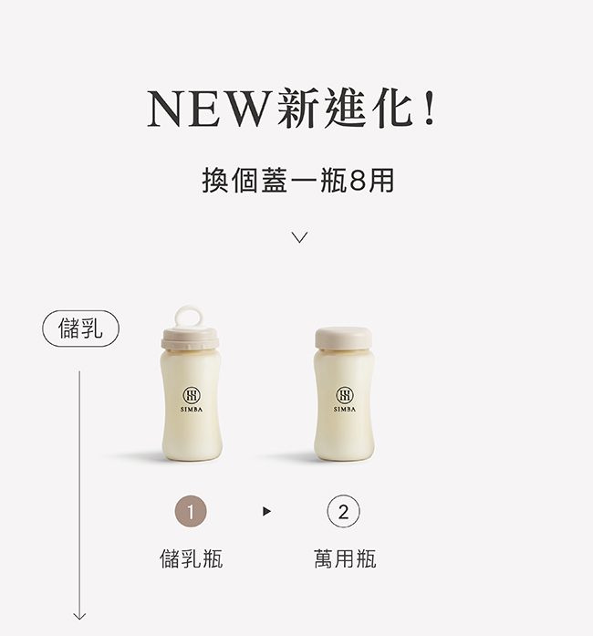 蘊蜜鉑金PPSU防脹氣奶瓶獨家首創一瓶八用創新紀錄!換蓋即一瓶多用,市售配件最齊全,可依階段餵養、儲乳、餵乳、學飲。