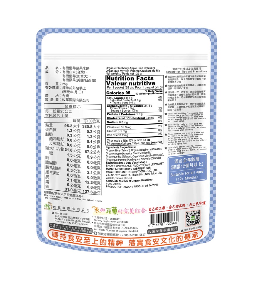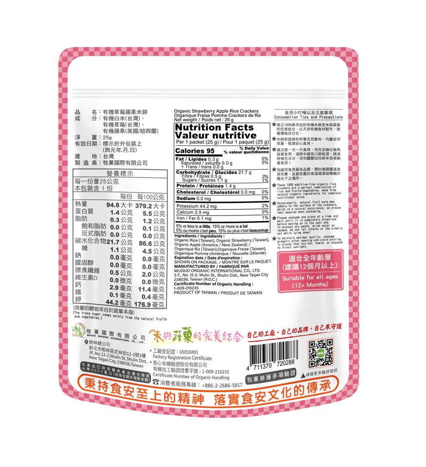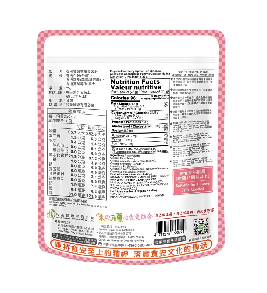 成份:有機白米(台灣)、有機蘋果(美國/紐西蘭)、有機蔓越莓(加拿大)、有機藍莓(加拿大)、有機草莓(台灣)