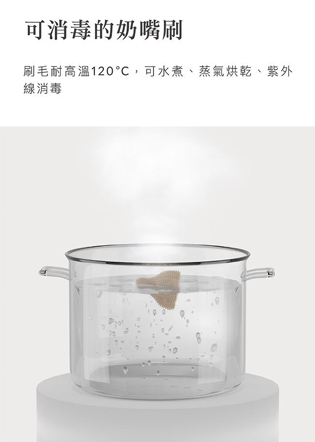 6. 刷毛耐高溫120˚C,可水煮、蒸氣烘乾、紫外線消毒。