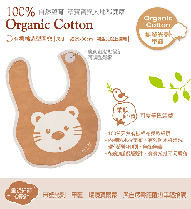 | 注意事項 | 有機棉布不使用任何化學添加劑, 不做精煉及漂白, 如有棉花莖葉組織產生的褐色小點屬正常現象, 經多次洗滌後即自然脫落。 |