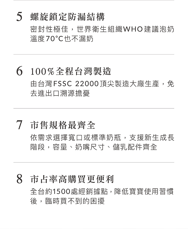 7.螺旋鎖定防漏結構,世界衛生組織WHO建議泡奶溫度70°C也不漏奶。