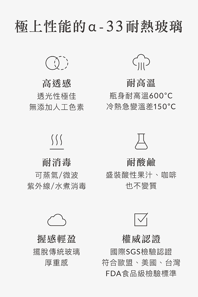 6.嚴選頂級α-33耐熱玻璃,不含雙酚A&S、塑化劑,耐高溫600˚C。
