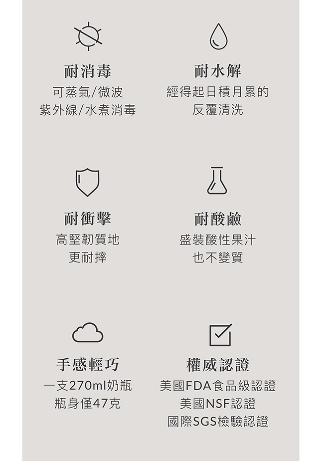 奶瓶:聚亞苯基碸(-20℃~ 197℃)