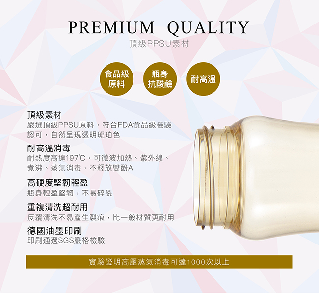 嚴選頂級PPSU原料,符合美國FDA食品級檢驗標準,瓶身耐高壓蒸氣消毒可達1000次以上。