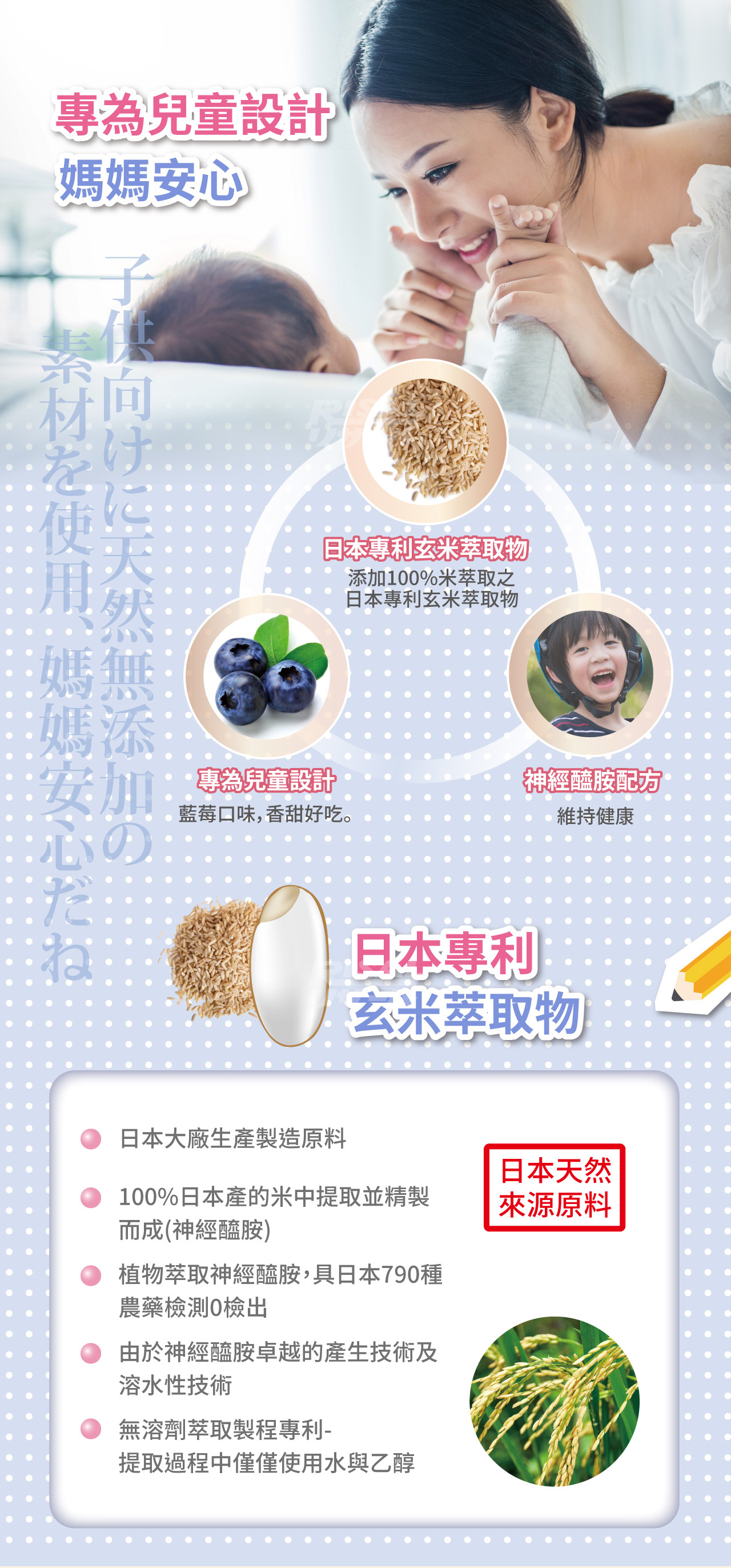 成分:蔗糖、藍莓果汁粉、綜合維生素{L-抗壞血酸(維生素C)、生育醇(維生素E)、菸鹼醯胺、微結晶纖維素、維生素A粉末、本多酸鈣、氰鈷胺明(維生素B12)、D-甘露醇、膽鈣化醇(維生素D3)、維生素 K1、鹽酸吡哆辛(維生素B6)、硝酸硫胺明(維生素B1,硝酸噻胺)、核黃素(維生素B2)、葉酸、生物素、麥芽糊精}、聚乙烯吡咯烷酮、硬脂酸鎂、硫酸鋅、二氧化矽、日本玄米萃取物(含10%神經醯胺)