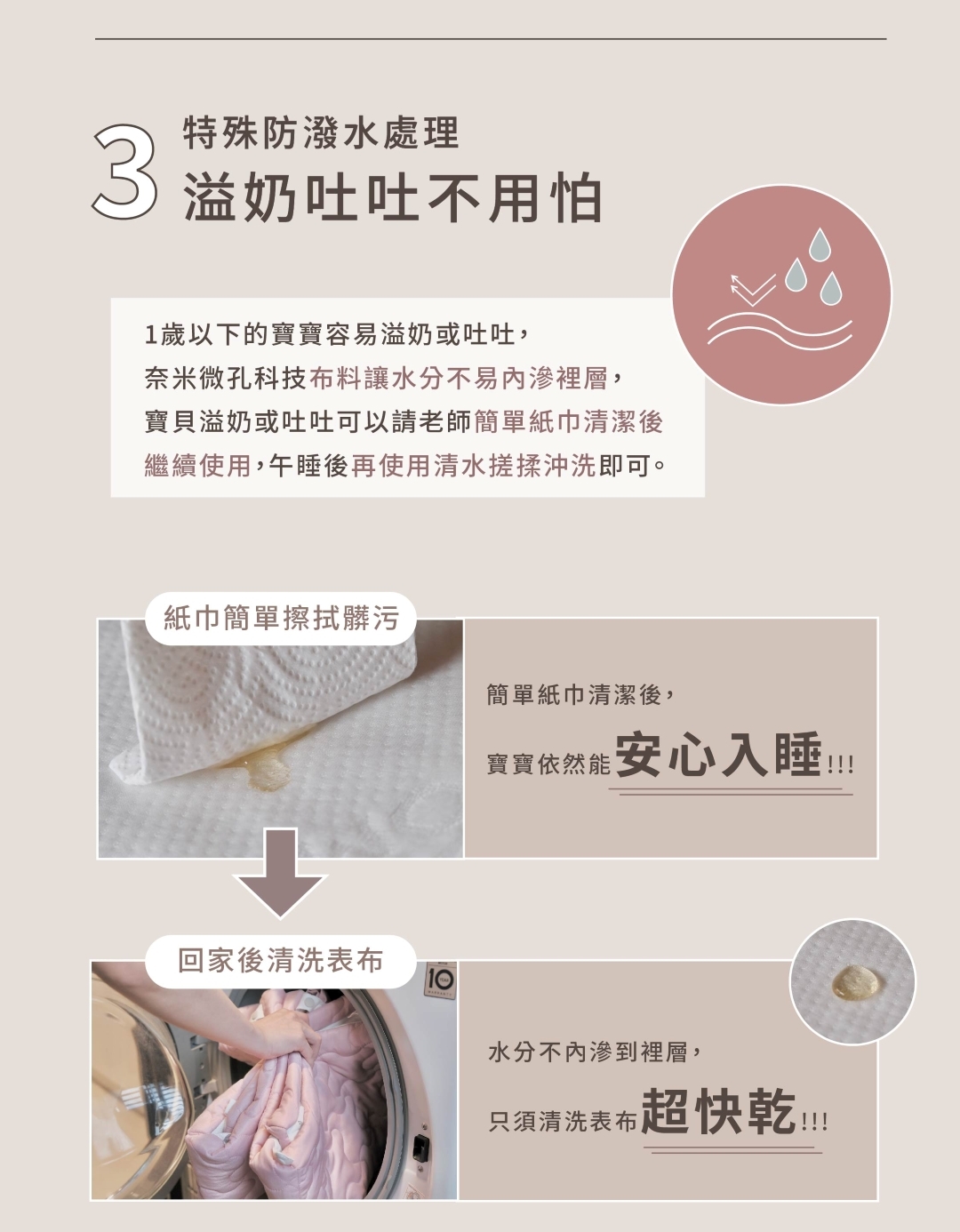 可直接機洗 (幼兒園後寶貝開始練習戒斷尿布,表布特殊防水設計不易滲透水分,發現後可以暫時以紙巾擦掉尿漬,回家後丟洗衣機機洗) |