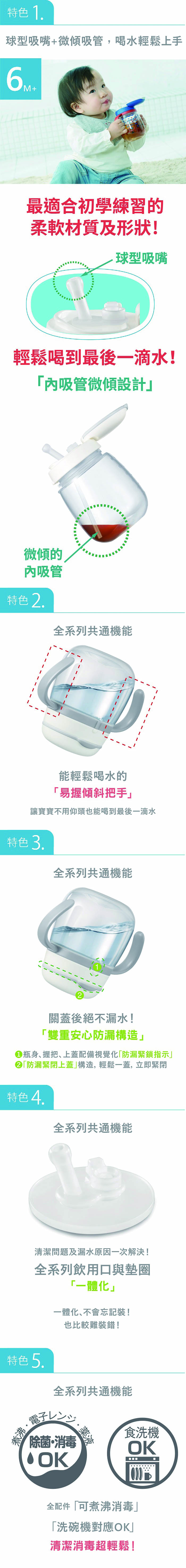 ●不同的吸嘴設計,能讓寶寶學習不同喝水方式,以及訓練到的不同部位的小肌肉。