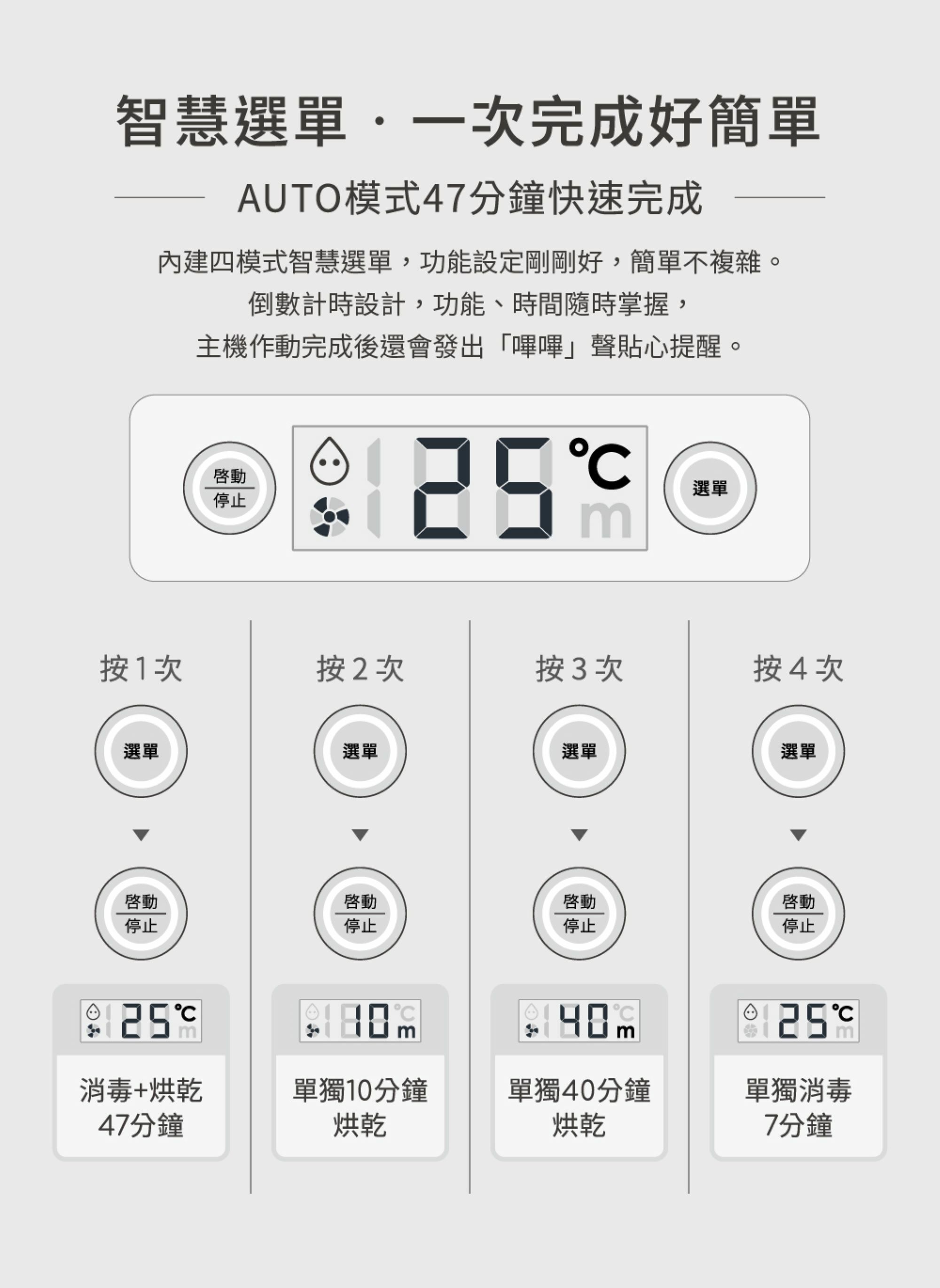 ※四大功能包含消毒+烘乾, 單獨消毒, 單獨烘乾10/40分鐘