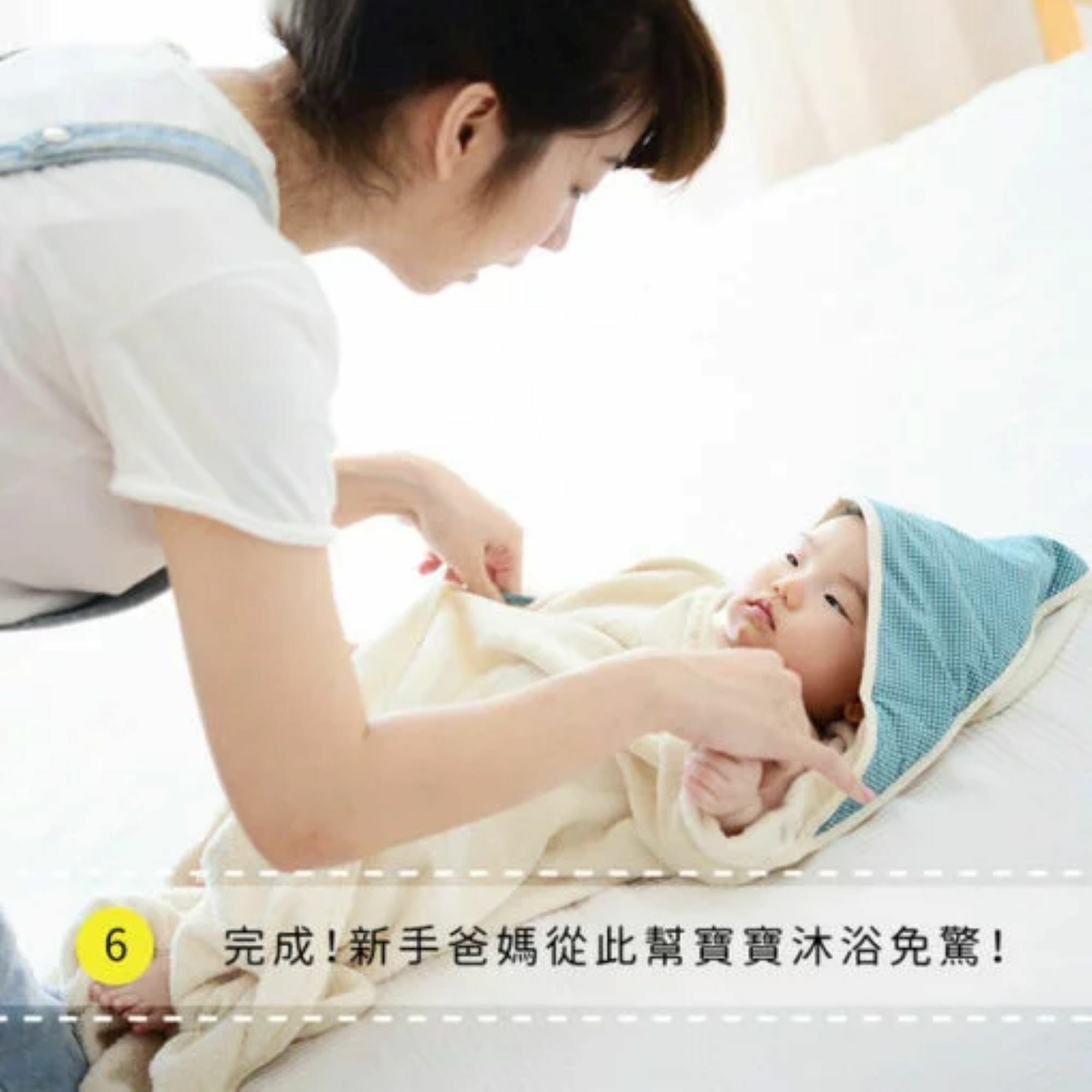 幫新生寶寶洗澡時,將小蘑菇浴巾專利扣環設計扣在脖子後方,幫寶寶洗澡浴巾不離身,不再手忙腳亂。