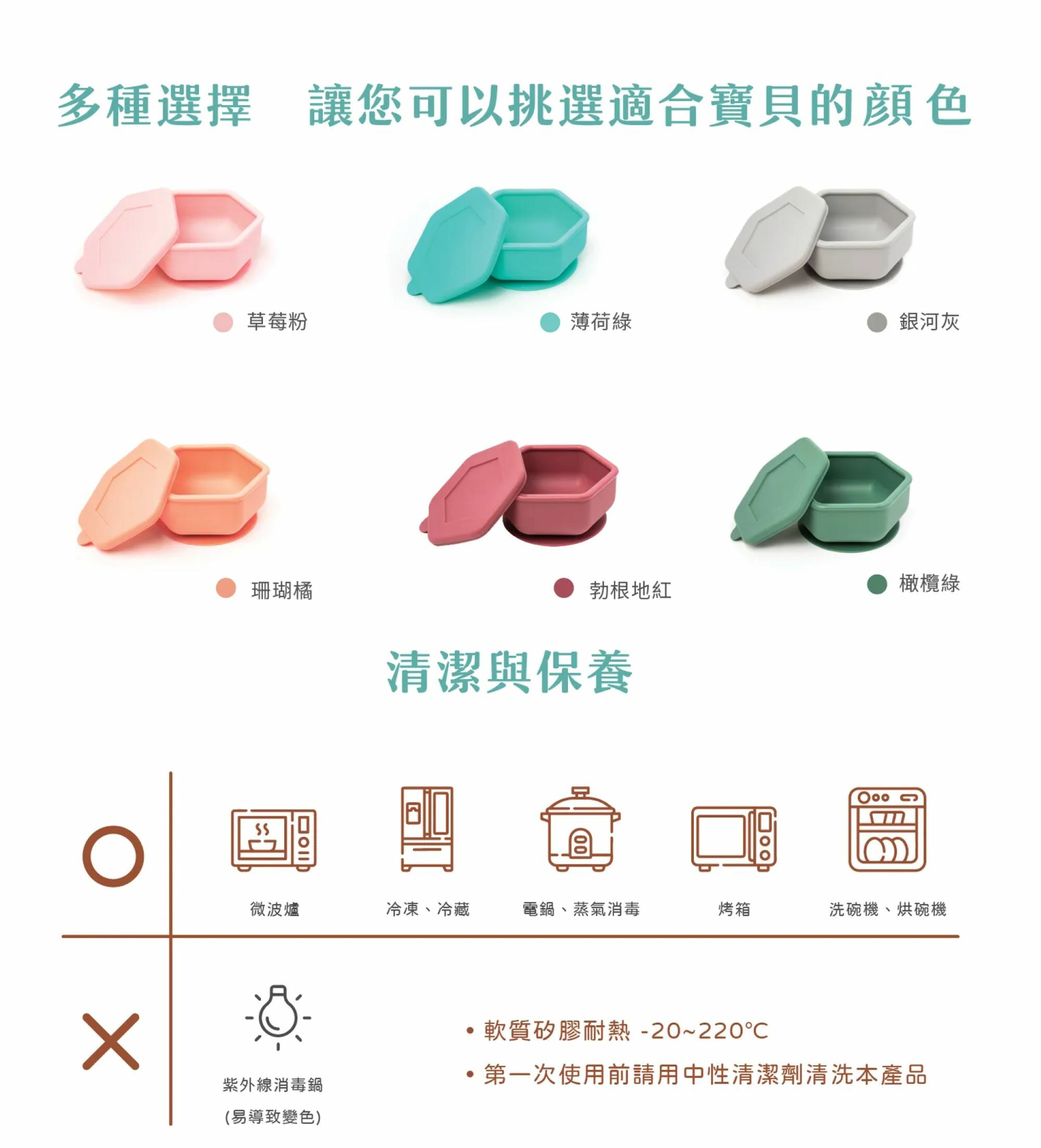 清潔方式:一般消毒鍋、洗碗機、烘碗機、微波爐,請勿使用紫外線消毒鍋,避免影響矽膠產品顏色有所差異。