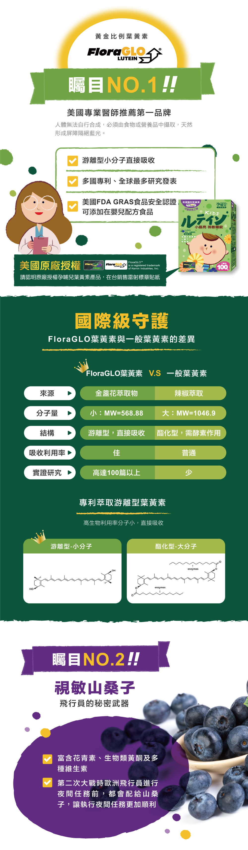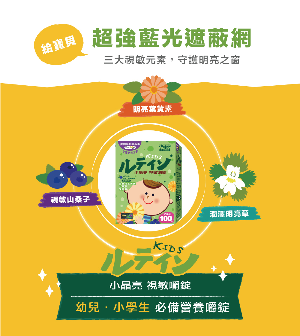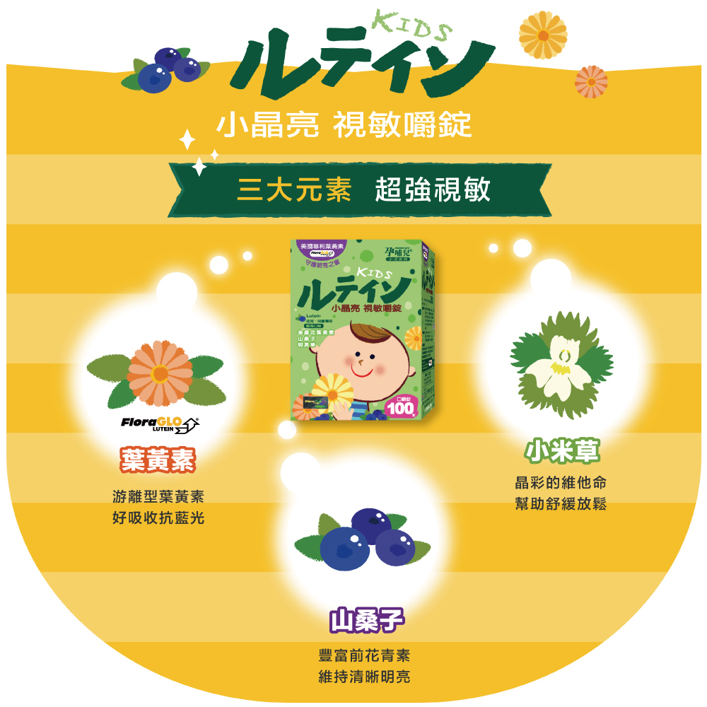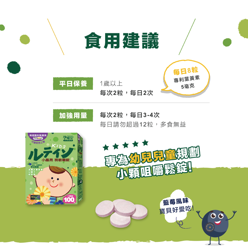 採用FloraGLOⓡ金盞花葉黃素:全球最知名葉黃素來源Kemin industries Inc. 榮獲專利認證,天然游離型態吸收度佳,無添加防腐劑、人工色素及人工甘味料,長期食用媽媽寶寶都安心,小顆口嚼鬆錠,好好吃藍莓口味。