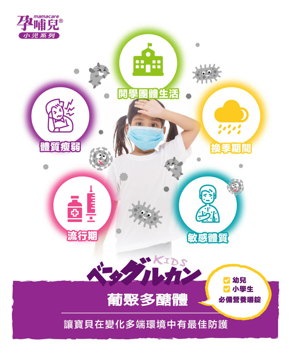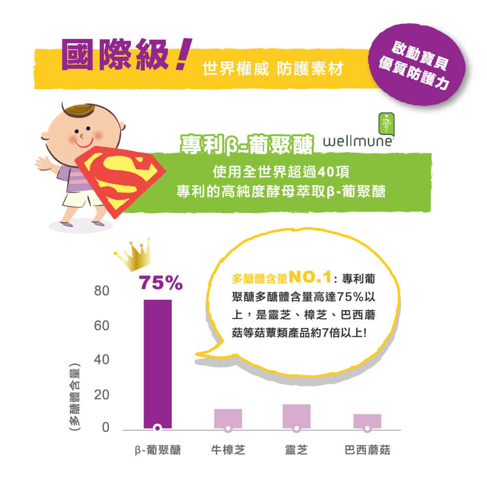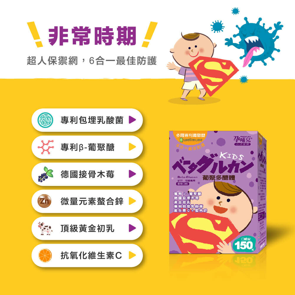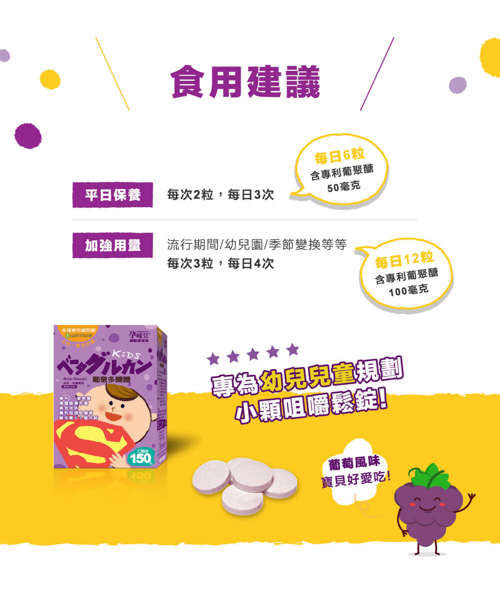 專為幼兒、兒童規劃的小兒配方,世界多項專利高純度酵母萃取葡聚醣,六合一全方位防護配方,啟動寶貝優質防護力,無添加防腐劑、人工色素及人工甘味料,長期食用媽媽寶寶都安心,小顆口嚼鬆錠,好好吃葡萄口味,寶寶最愛。