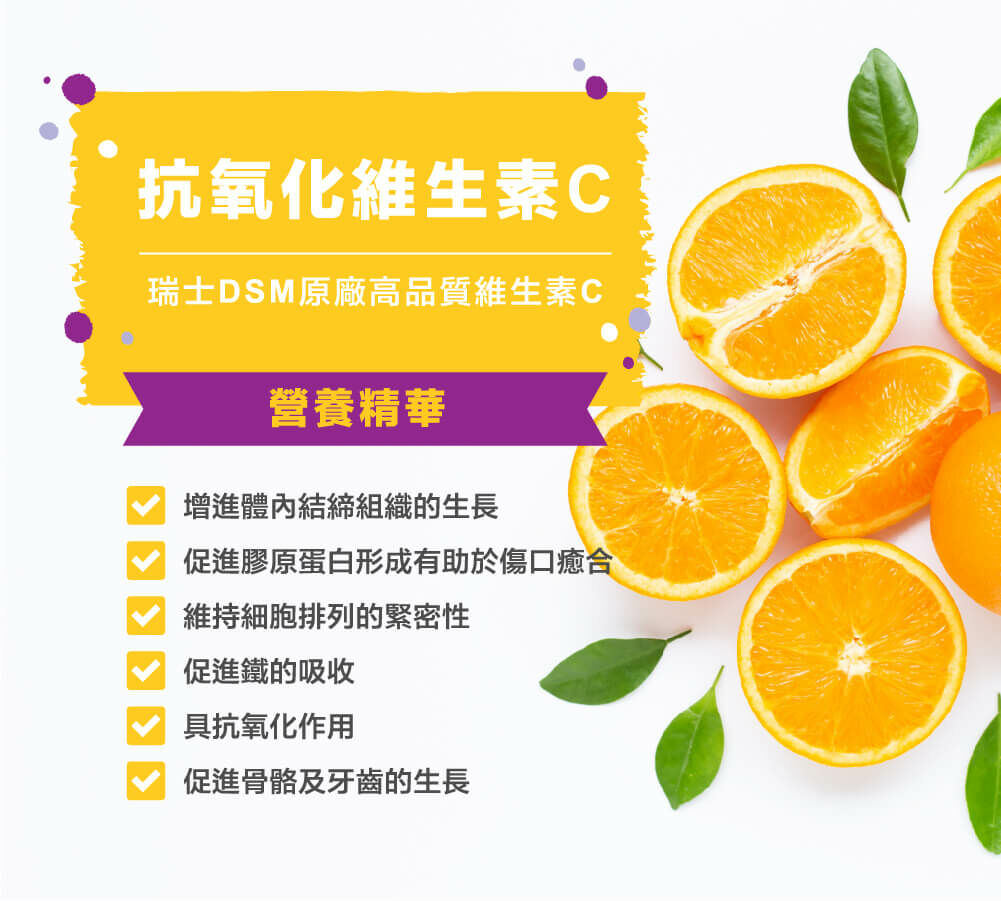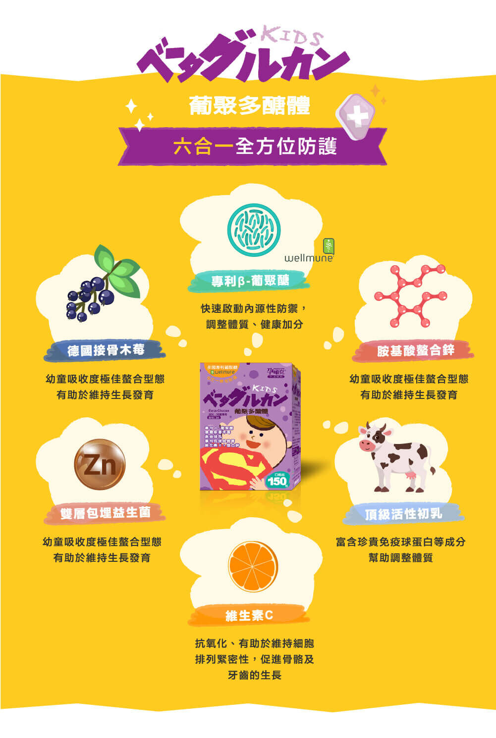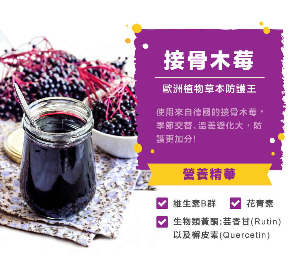 葡萄糖、果汁粉、乳糖、微晶纖維 素、專利β-聚葡萄糖Wellmune®、硬酯酸鎂(食品製造用)、接骨木莓、維生素C、香料、胺基酸螯合鋅、蘋果酸、初乳蛋白、嗜乳酸桿菌A菌、比菲德氏B菌、乾酪乳桿菌C菌