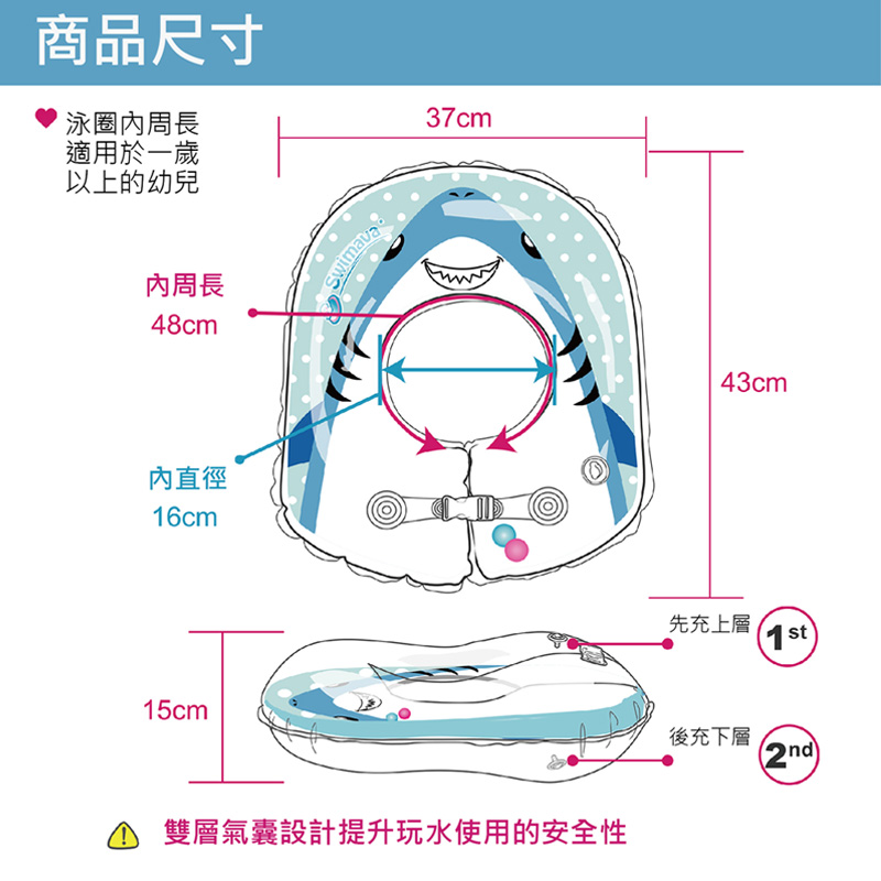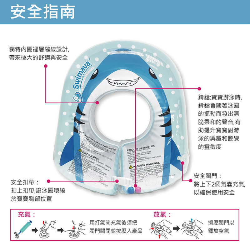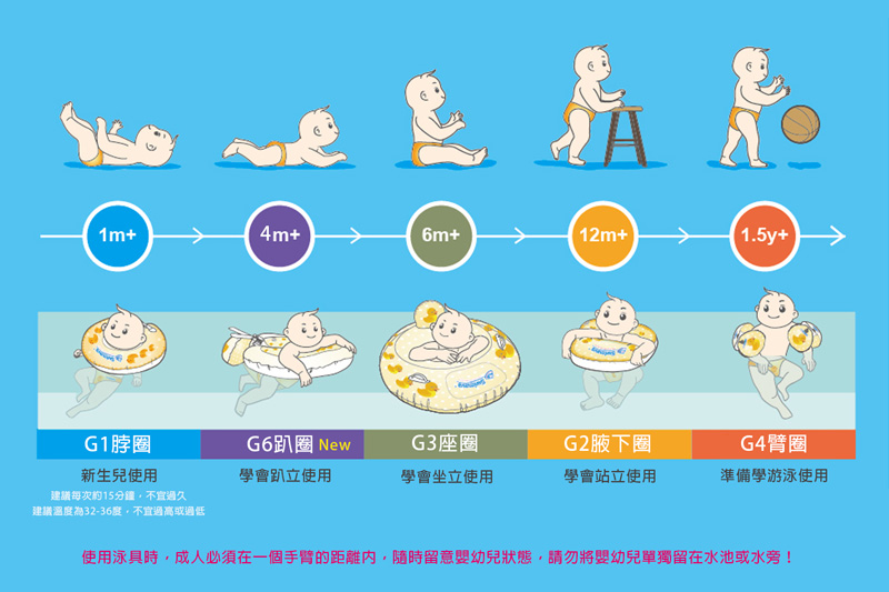 - 請留意使用任何一款泳圈,當寶寶拍水時須隨時留意寶寶重心,避免翻覆