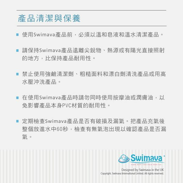 Swimava在全球已經有超過1,000,000位快樂的Swimava寶寶愛用者!Swimava是專為寶寶出生後接觸的第一項游泳運動而設計的知育泳具。源於英國開發設計,為世界各國寶寶愛用泳具品牌,在日本、韓國銷售第一。通過世界各國品質安全檢驗,講究做工與材質,保護寶寶的柔軟肌膚。讓嬰兒學會行走,甚至爬行前,可以藉由Swimava享受自在游泳的樂趣!