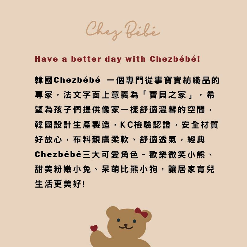 韓國Chezbébé 一個專門從事寶寶紡織品的專家,法文字面上意義為 「寶貝之家」,就是希望為孩子們提供像家一樣舒適溫馨的空間,韓國設計生產製造,KC檢驗認證安全材質好放心,布料親膚柔軟、舒適透氣,經典Chezbébé三大可愛角色–歡樂微笑小熊、甜美粉嫩小兔、趣味奶黃小虎,讓居家育兒生活更美好!